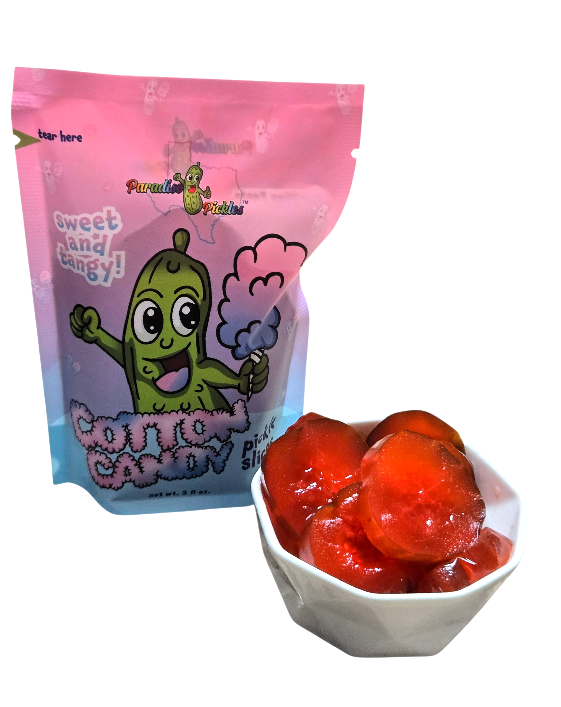 A delightful trio of sweet pickle snack packs featuring The Original Cotton Candy Pickle Snacks! Sweet and fluffy Cotton candy flavors with tangy pickle, offering a unique blend of tangy and sweet tastes in each bite.